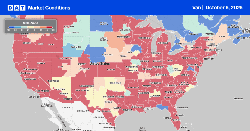 Last week, the dry van load-to-truck ratio rose to 7.67, as load posts increased slightly at month-end and equipment posts dropped by 5%. Brokers faced capacity challenges in California, particularly in the Stockton market, where load posts were up almost 20% week-over-week and overall California load posts increased by 6%. This was due to a decrease in trucks typically arriving from Los Angeles daily, leading to a 10% fall in loads moved on the high-volume Los Angeles to Stockton lane. The significant 17% drop in import containerized volume from Asia during September is likely the direct cause of this short-term capacity imbalance. Approximately 50% of the monthly imports at the Ports of Los Angeles and Long Beach originate in China, a nation currently involved in a trade war with the U.S.
