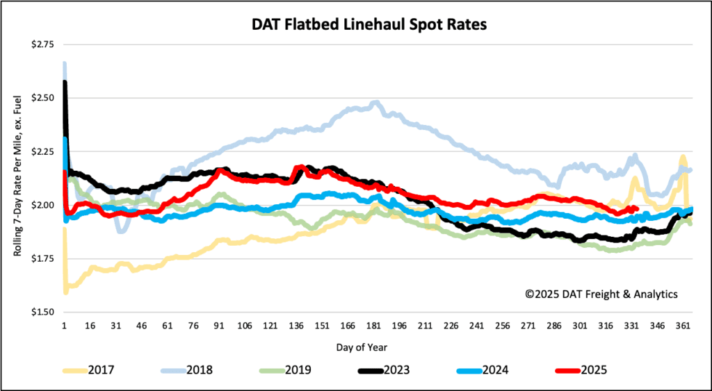 The national average flatbed spot rate held steady for the third consecutive week, remaining at $2.01 per mile. This rate is currently just 2%, or $0.03 per mile, above the rate recorded at the same time last year.
