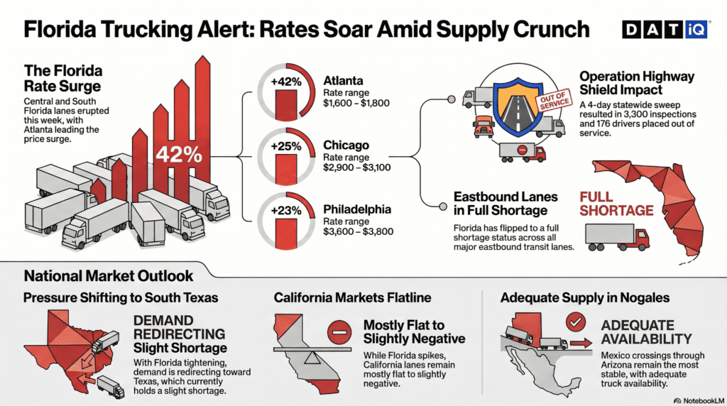 - Florida → Atlanta: $1,600–$1,800 (+42%) load posts +17% w/w, reefer spot +10% w/w